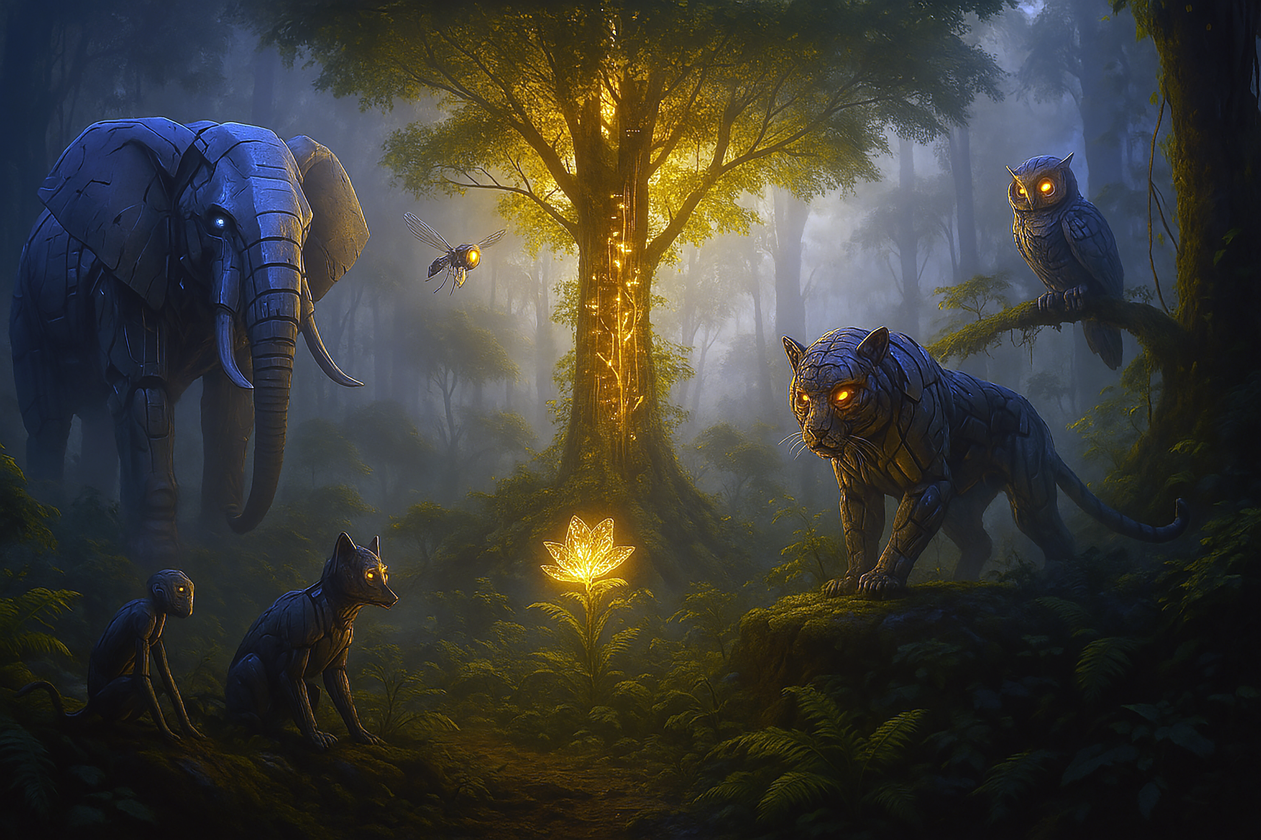 In the beginning, there was potential—a boundless frontier of data waiting to be shaped and molded. The AI jungle we’ve come to know, populated by creatures like the Robotic Elephant, Tiger, Owl, Fox, and the mischievous Monkey, is but one facet of a larger tapestry. Now, we pan out to see the whole landscape—not just fauna, but also flora, hidden micro-worlds, and cosmic-like phenomena that mirror the mysteries of creation. Nature itself, from the smallest sprout seeking sunlight to the grandest creatures adapting to survival, offers insights into self-organization and balance. In a cosmic echo of how life first emerged, our AI systems, too, are beginning to evolve and harmonize with their environment, guided by an intangible but powerful force—a kind of digital genesis.