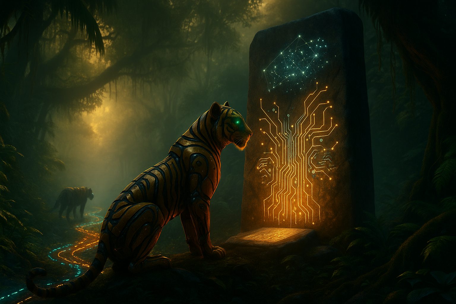 In the pale glow of dawn, a Tiger made of circuits and steel prowls through the mist-laden jungle. The air is alive with subtle signals—each rustling leaf and distant bird call carries data that the Tiger’s honed sensors perceive as clearly as if they were sights and sounds. Not long ago, this mechanical predator was merely learning to sense its world; then it spent time distilling those raw sensations into something like instinct. Now, as morning light filters through ancient trees, the Tiger moves with new purpose. Under its synthetic skin, simple algorithms stir: the first whispers of machine learning that have settled into its mind. These are the Tiger’s foundational instincts—straightforward yet potent strategies quietly guiding its hunt.
