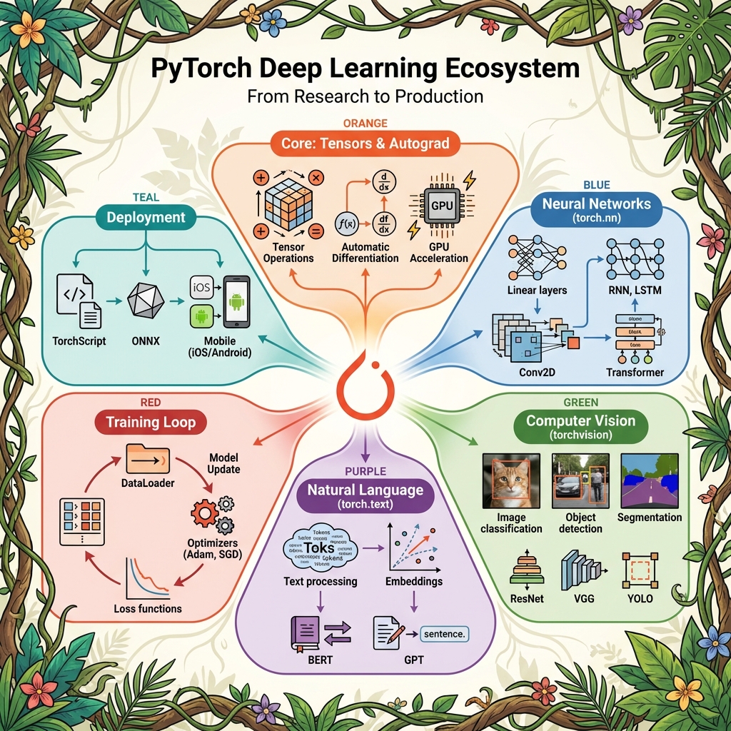 PyTorch is a deep learning framework that lets you build neural networks from scratch. While scikit-learn provides ready-made algorithms, PyTorch gives you building blocks to construct custom architectures.