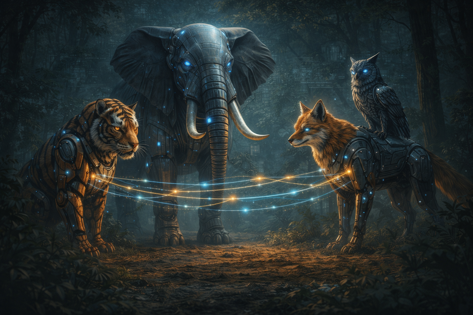 The jungle’s AI inhabitants—the Elephant, Tiger, Owl, and Fox—have each demonstrated unique capabilities. The Elephant masters the MLOps pipeline, the Tiger excels in pattern recognition, the Owl offers predictive insights, and the Fox refines strategies via reinforcement learning. Yet, they have been operating largely in isolation.